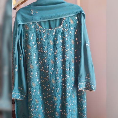 Chikankari on Georgette adorned with resham threads, kasab and gotapatti work, perfect for any occasion and festive wear.