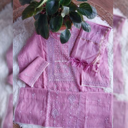 Chikankari on Soft Mul Chanderi fabric adorned with sequins, ari pearls, cutdana work and kasab that comes with kurta and dupatta, perfect for any occasion and festive wear.