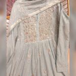 Chikankari on Soft Mul Chanderi fabric adorned with mukaish and pitta work in anarkali style, blending delicate artistry with timeless sofistication, perfect for any occasion and festive wear.