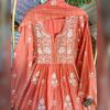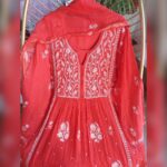 Chikankari on Soft Mul Chanderi fabric adorned with thread work, poth work and cutdana work in anarkali style, blending delicate artistry with timeless sofistication, perfect for any occasion and festive wear.