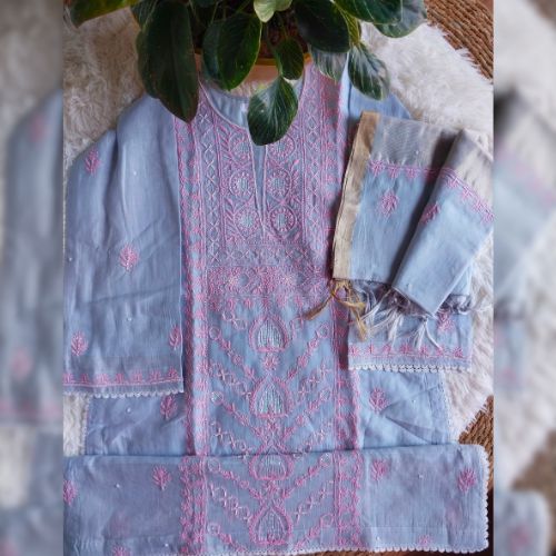 Chikankari on Soft Mul Chanderi fabric adorned with pink resham threads, ari pearls and cutdana work that comes with kurta and dupatta, perfect for any occasion and festive wear.