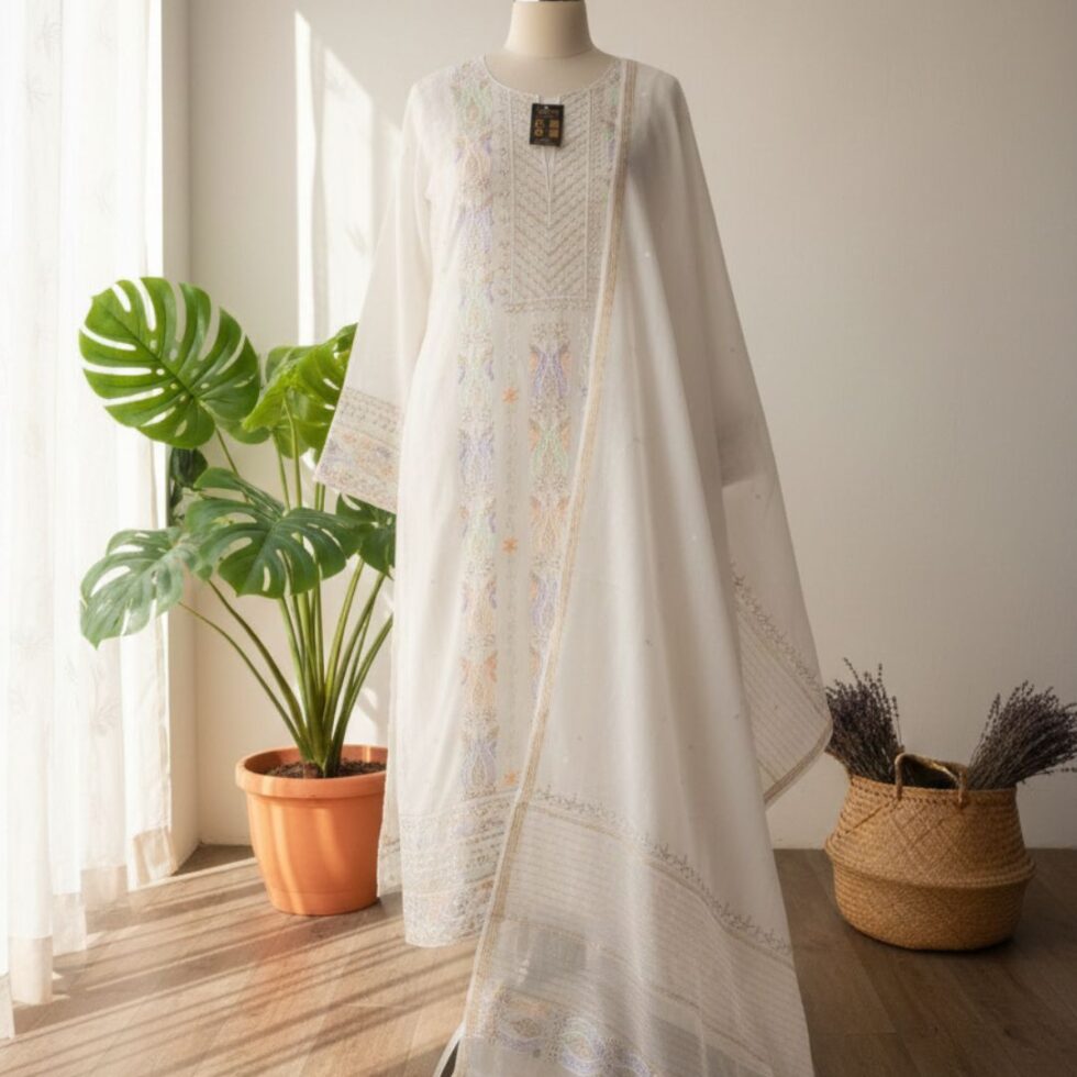 Elegance in every thread, Chikankari on Mul mul with kasab, poth work and cutdana work.