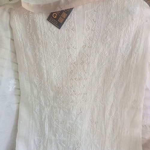 Chikankari on Soft Mul Chanderi fabric adorned with resham threads, ari pearls, cutdana work and kasab Unstitched, perfect for any occasion and festive wear.