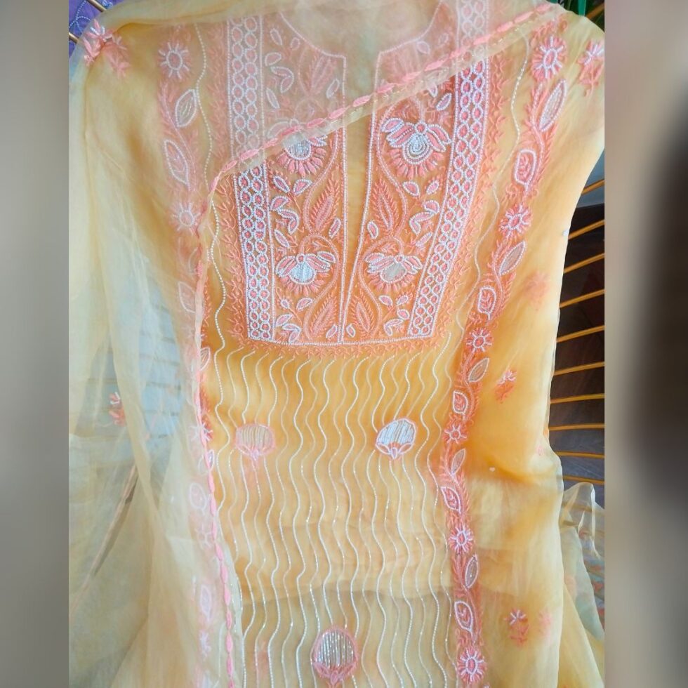 Chikankari on Soft Organza fabric adorned with resham threads and poth and cutdana work blending delicate artistry with timeless sofistication, perfect for any occasion and festive wear.