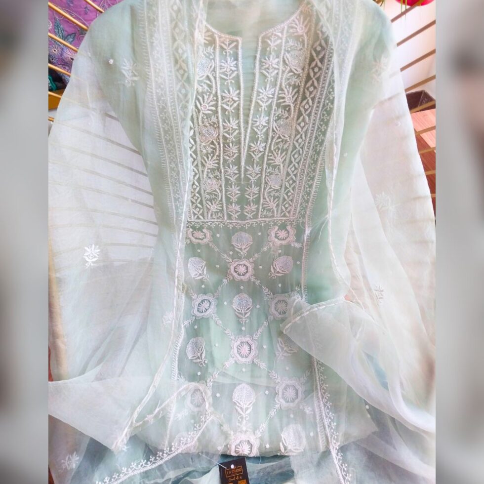 Chikankari on Soft Organza fabric adorned with resham threads and poth and cutdana work blending delicate artistry with timeless sofistication, perfect for any occasion and festive wear.
