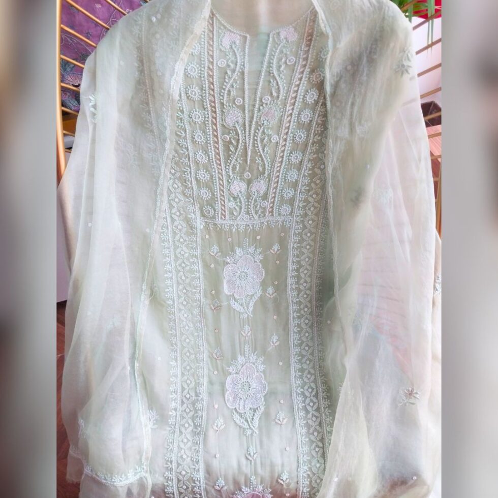 Elegance in every thread, Chikankari on Soft Organza fabric with kasab, poth work and cutdana work.