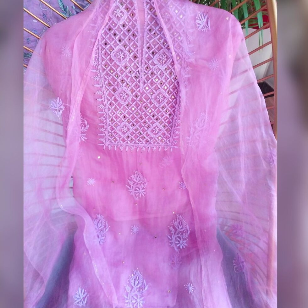 Chikankari on Soft Organza fabric adorned with resham threads and mukaish work blending delicate artistry with timeless sofistication, perfect for any occasion and festive wear.