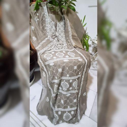 Chikankari on soft chanderi mul fabric with our signature ari pearl / cutdaana work with murri and bakhia stitch on festive shades that comes with kurta,dupatta, inner and bottom.Ready to wear