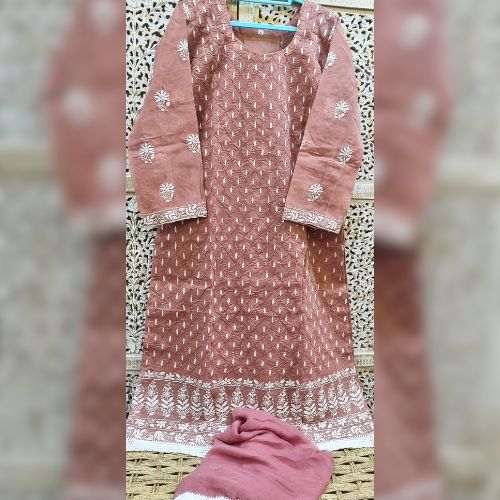 This handcrafted chikankari cotton kurta is a super breezy fabric with our thread embroidery and sequence work on it. Ready to wear Kurta, inner and dupatta chiffon with chrochet lace