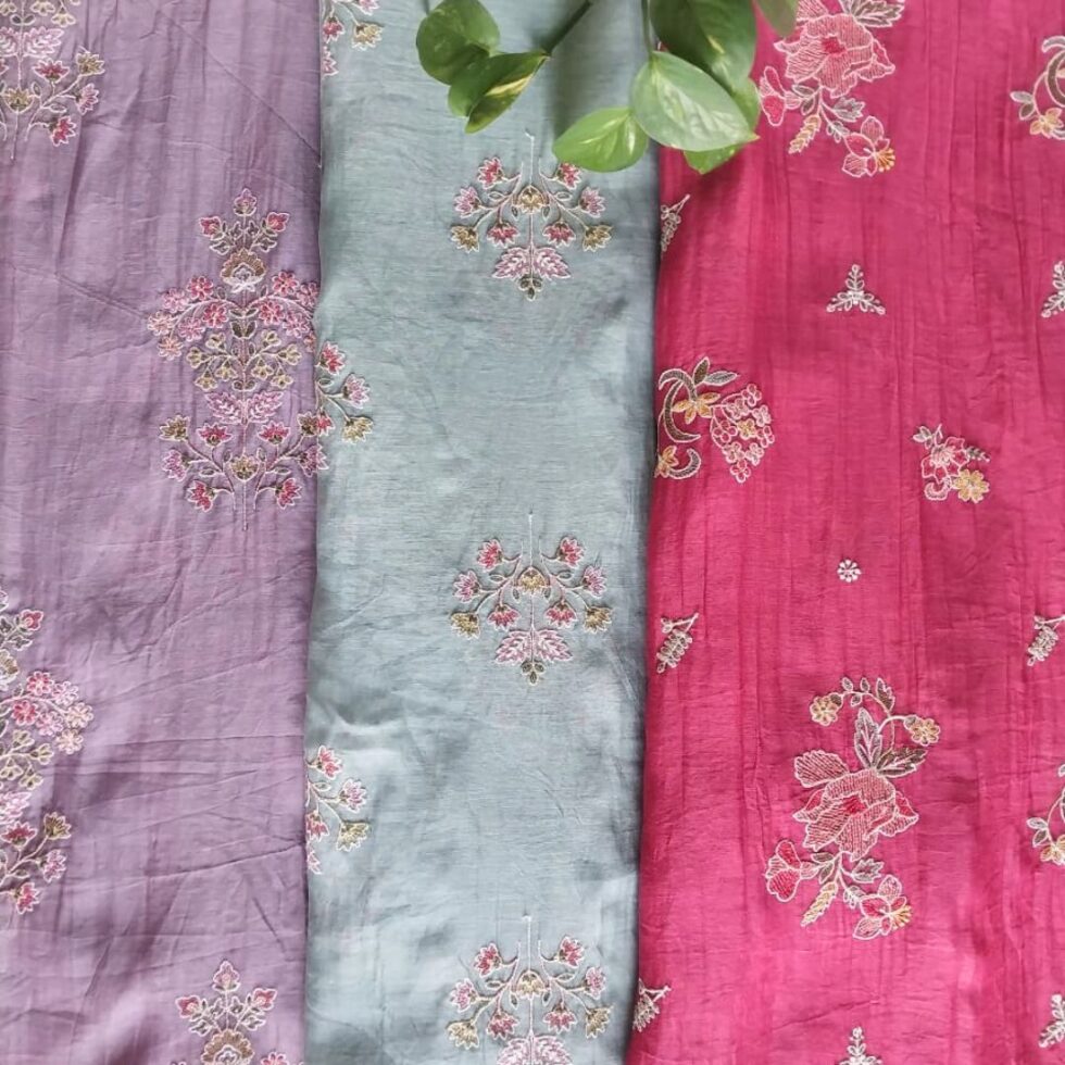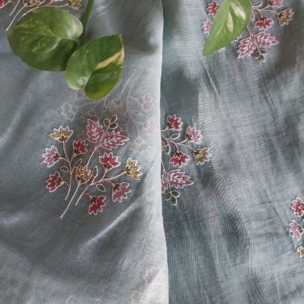 Elegance in every thread, Mul Chanderi fabric with thread work and delicate floral motifs.