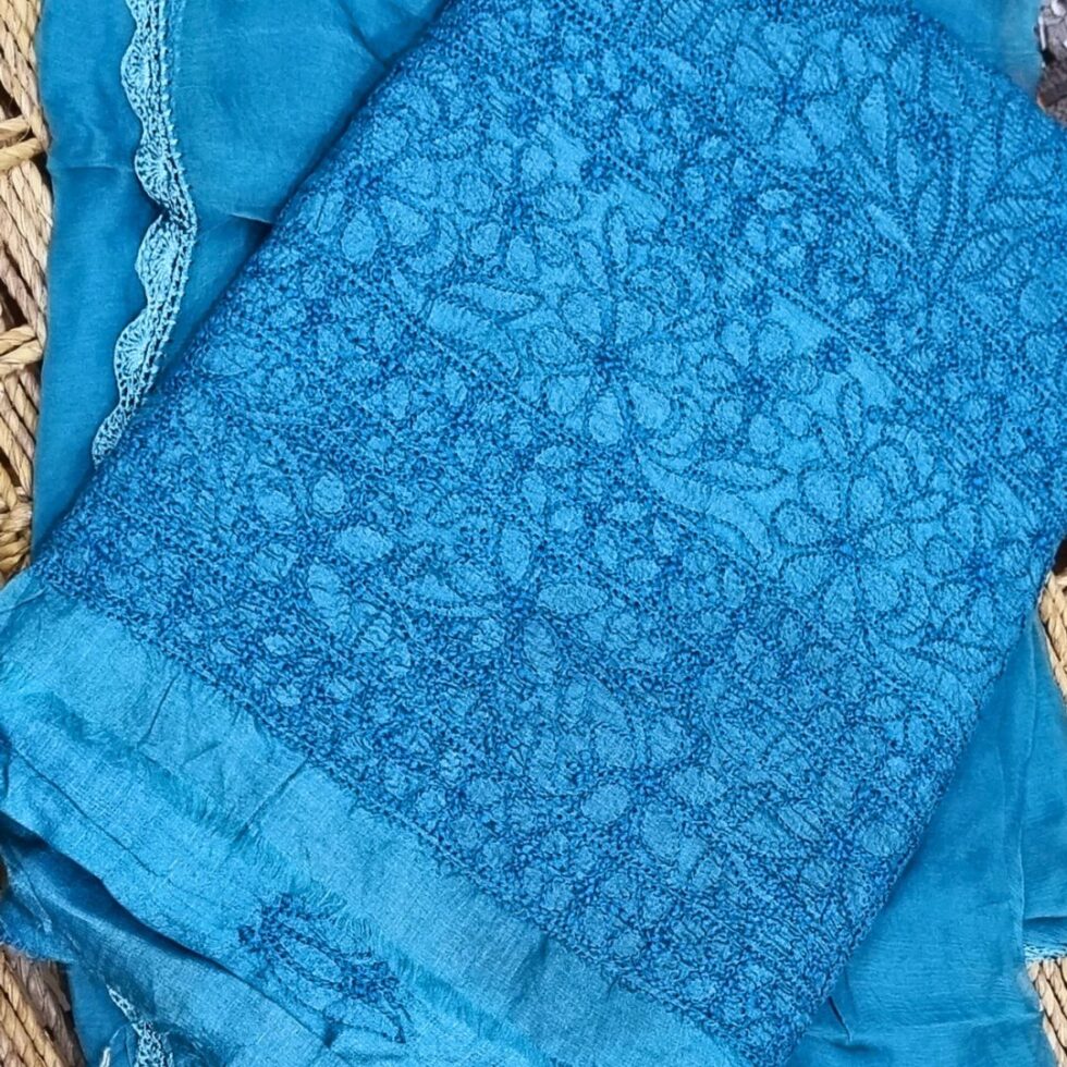 Pure Muga Silk Chikankari with Shade work Peacock Blue, Unstitched Kurta & Dupatta