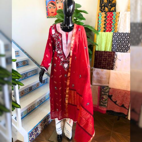 Chikankari on soft mul fabric with ari pearl/cutdaana work, stitch that comes with kurta,dupatta and bottom