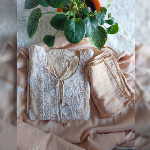 This tissue silk chikankari piece features intricate stitches and elegant add-ons, blending delicate artistry with timeless sophistication. Ready to wear